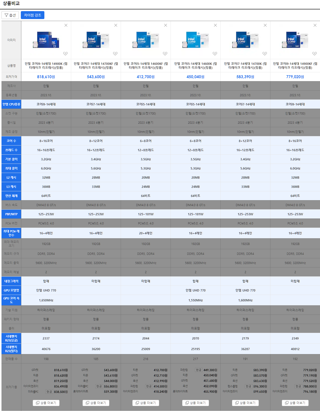 다나와에서 PC부품 CPU-인텔을 선택하고 아래처럼 선택해주었어요