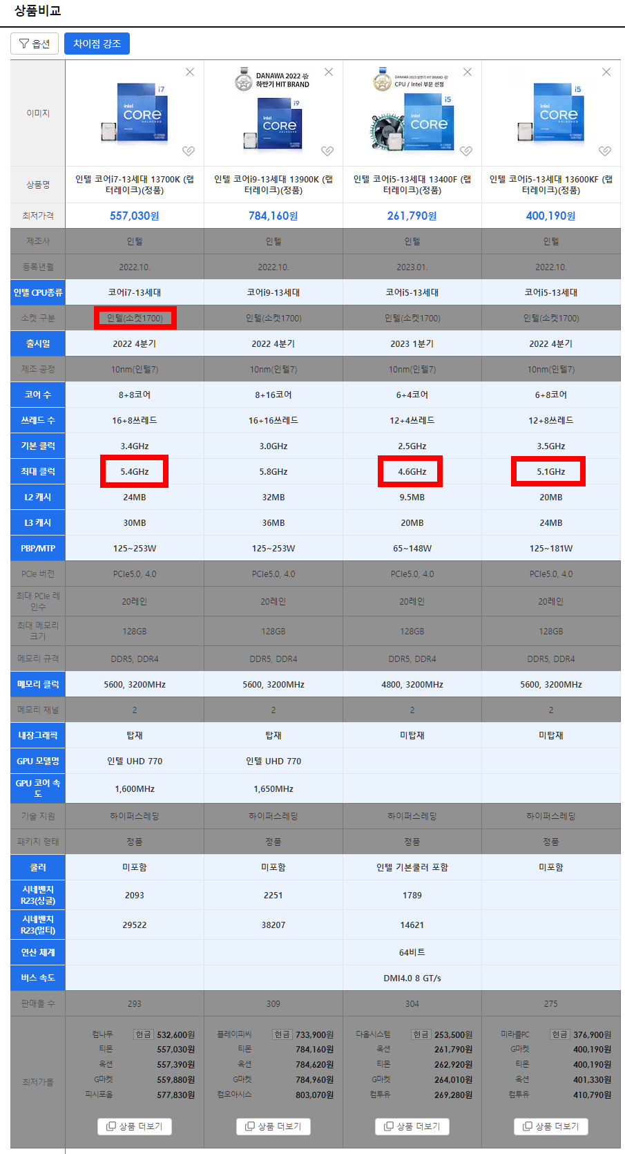 13세대 i5 가 하나는 4.6GHz 이고 하나는 .5.1GHz인데 가격차이가 많이 나네요.